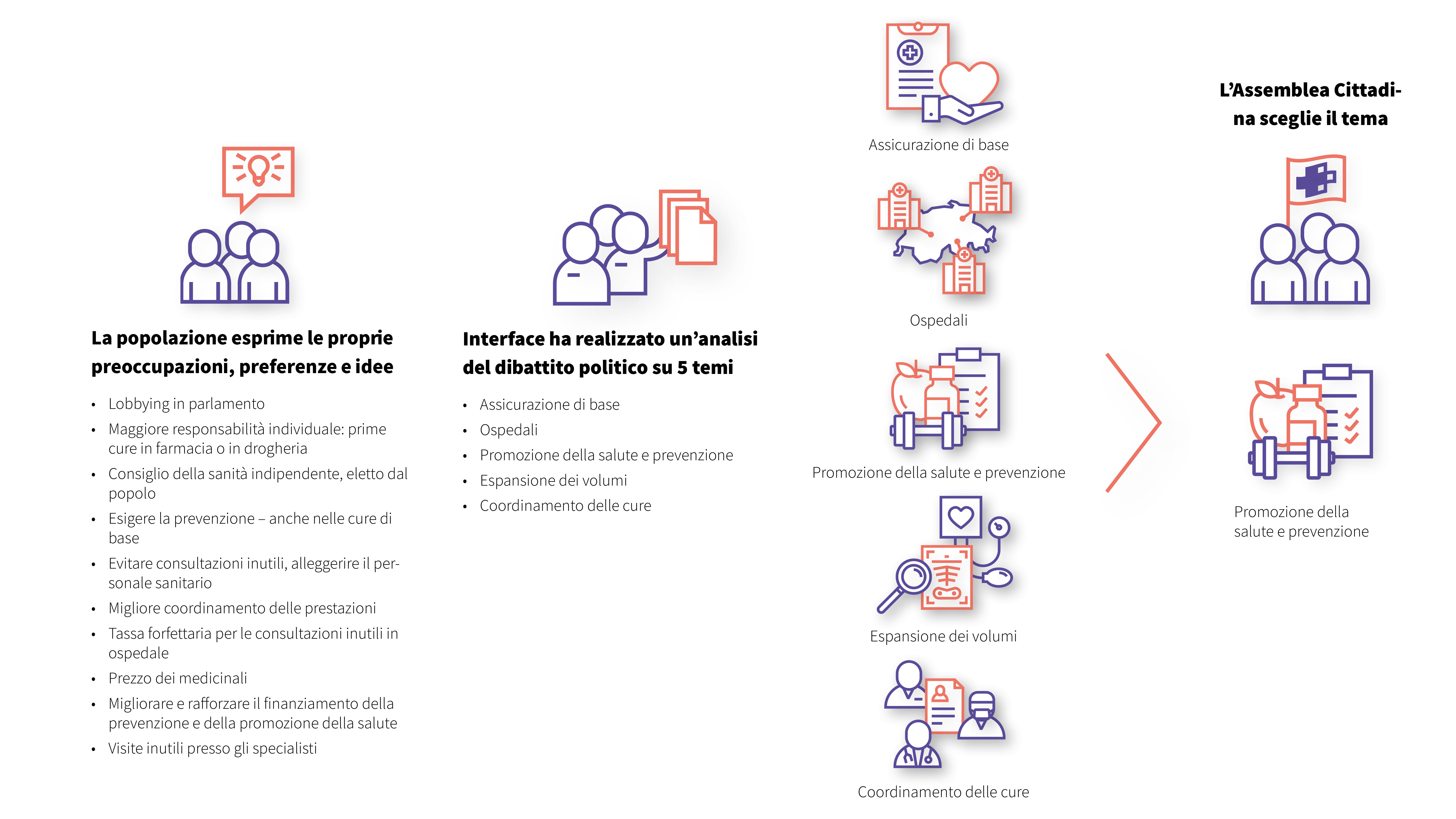 Un factsheet , con un argumentarium sul tema prioritario, elaborato dagli specialisti, ha fornito la base contenutistica per le discussioni successive. L’Assemblea Cittadina ha raccolto nei suoi risultati informazioni sul tema «Promozione della salute e prevenzione», ritenute importanti per discutere l’argomento.