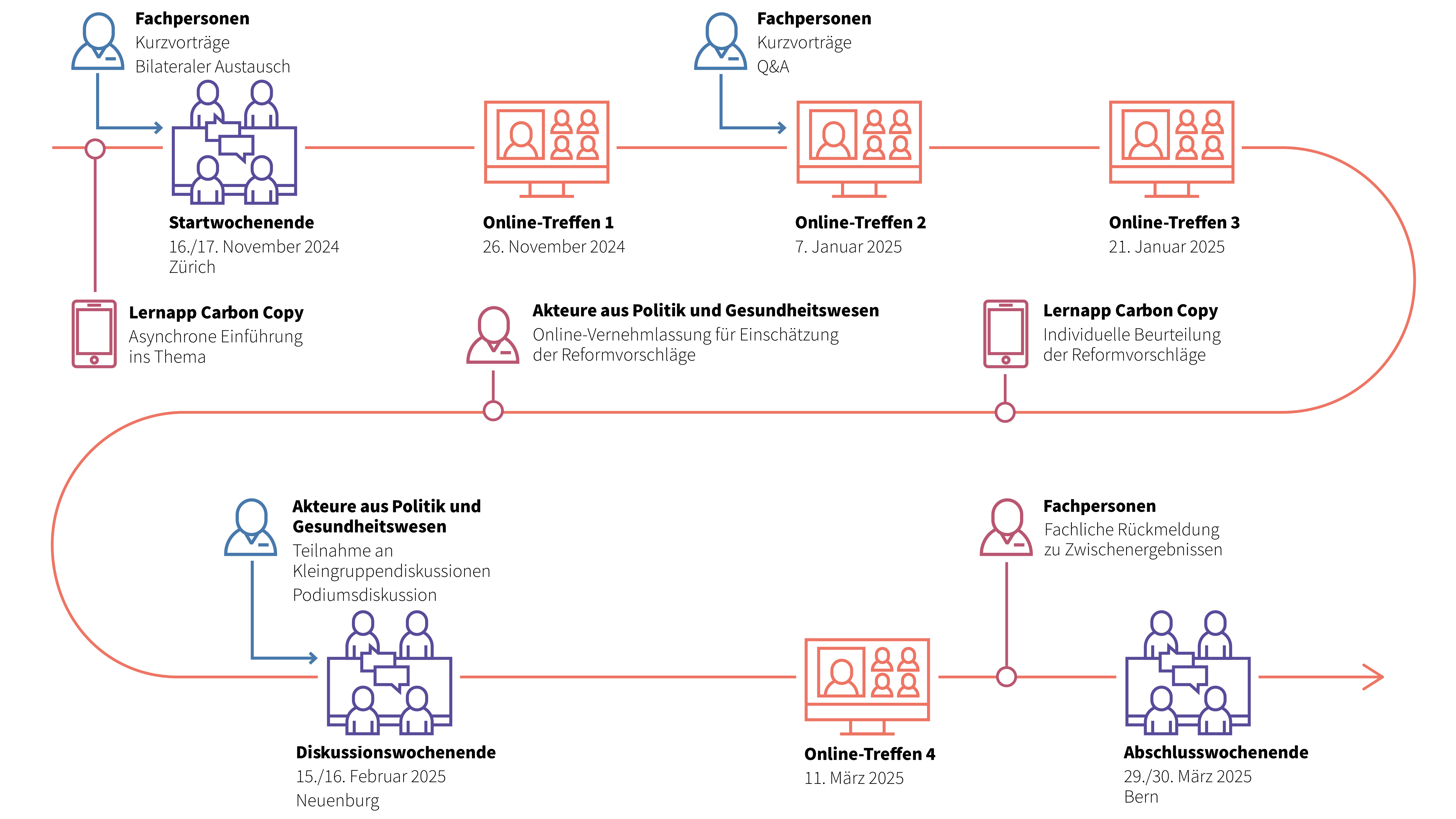 Der Bevölkerungsrat tagte an drei Wochenenden in Zürich, Neuenburg und Bern, sowie an vier Online-Treffen. In der ersten Phase informierten sich die 100 Teilnehmenden zum Thema «steigende Gesundheitskosten» und legten fest, an welchem Schwerpunkt sie arbeiten wollen. In der zweiten Phase tauschten sie ihre Meinungen untereinander aus und diskutierten mit Politikerinnen und Politikern. Am Ende bereiteten sie die gewonnenen Erkenntnisse und Vorschläge in einem Abschlussbericht für die Öffentlichkeit und Politik auf.