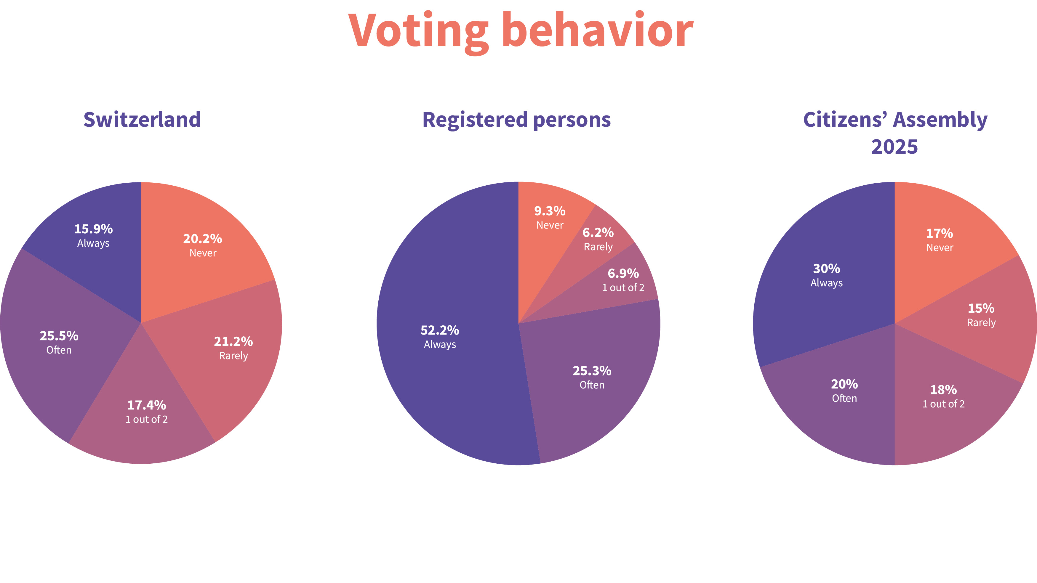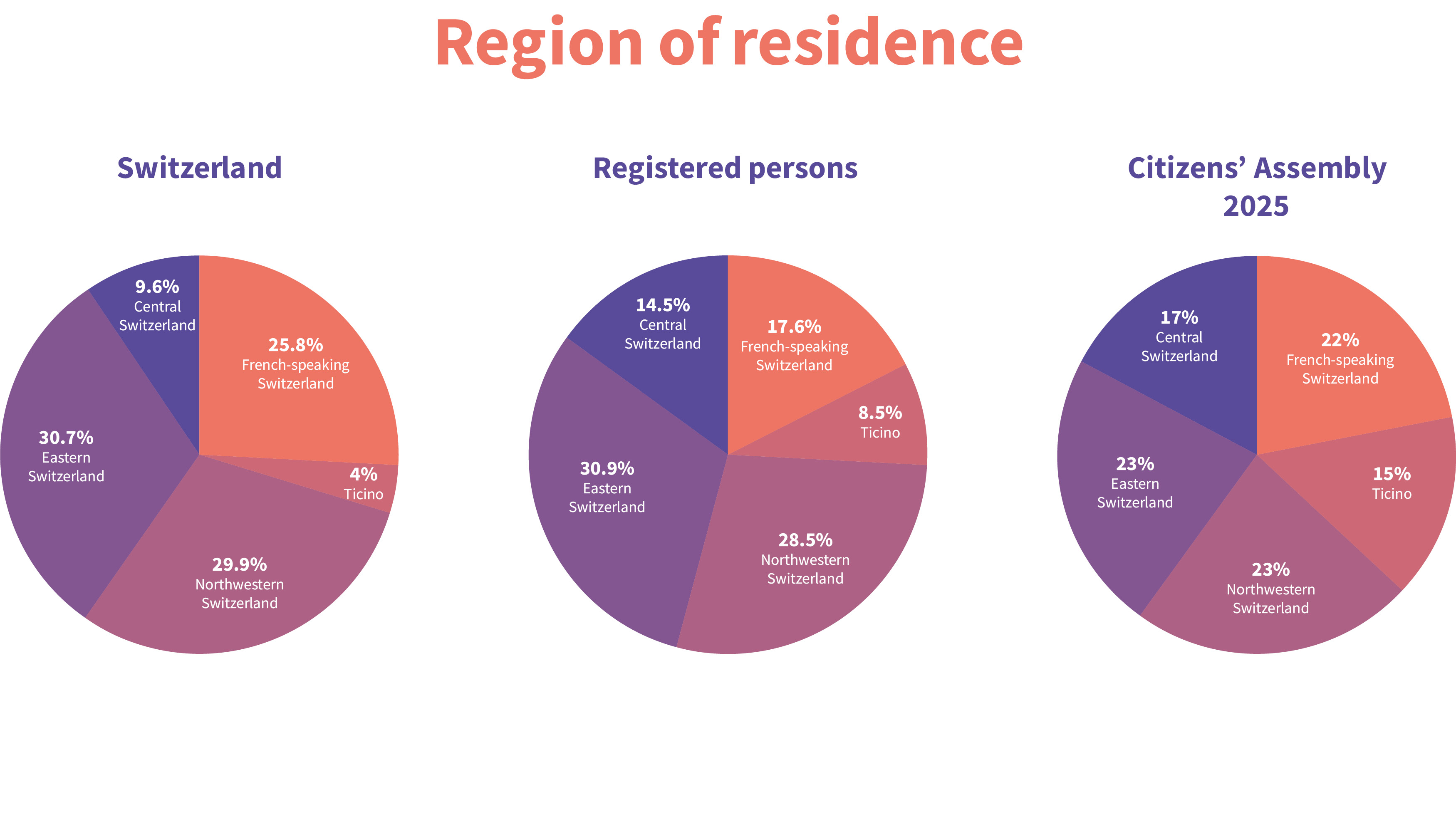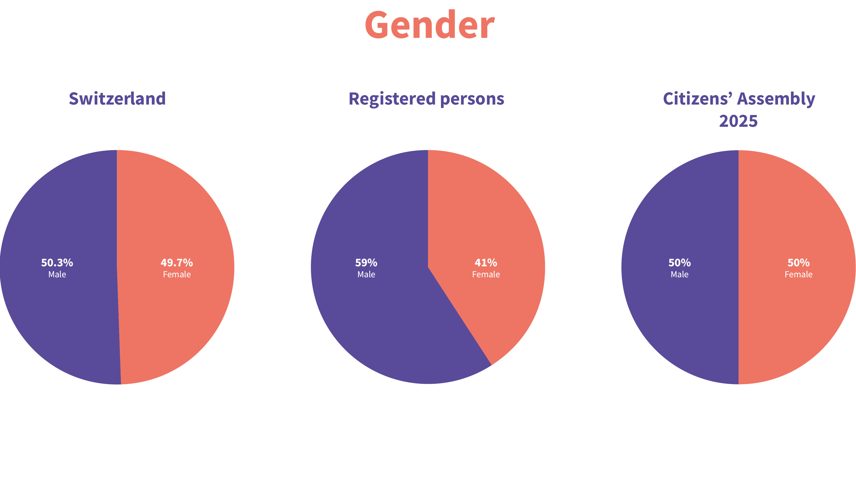 The following figures illustrate the composition of the Citizens’ Assembly 2025 in comparison with the Swiss resident population, as well as with the 2,004 people who registered to participate in the Citizens’ Assembly.