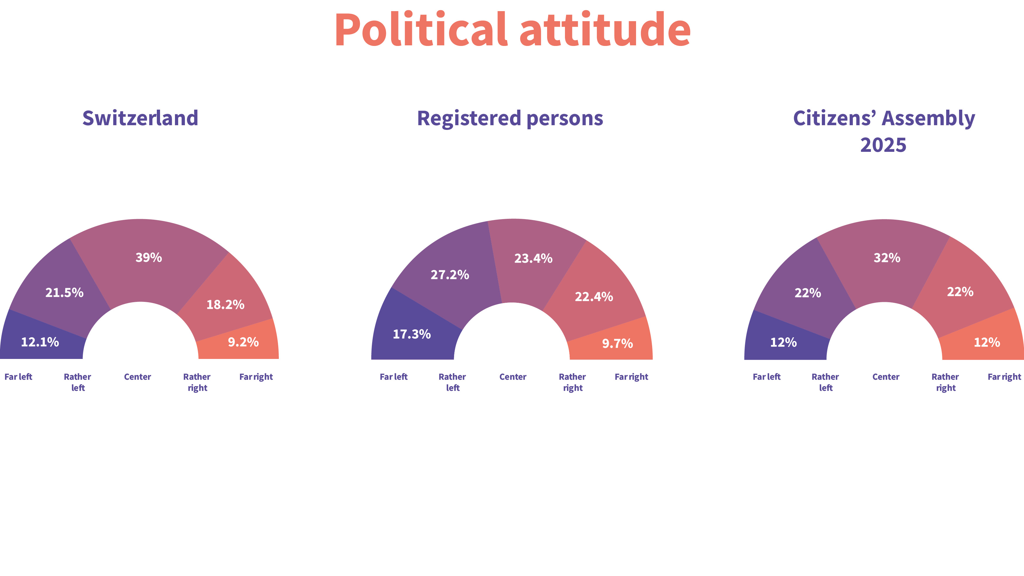 In Citizens’ Assemblies, a two-stage sortition procedure is mostly used to achieve the most accurate possible reflection of the overall population (descriptive representation). However, this alone does not guarantee that a citizens’ assembly will also include a wide variety of opinions and perspectives. For this reason, political orientation was also taken into account when forming the Citizens’ Assembly. The aim was to achieve the most balanced distribution of different political orientations possible.