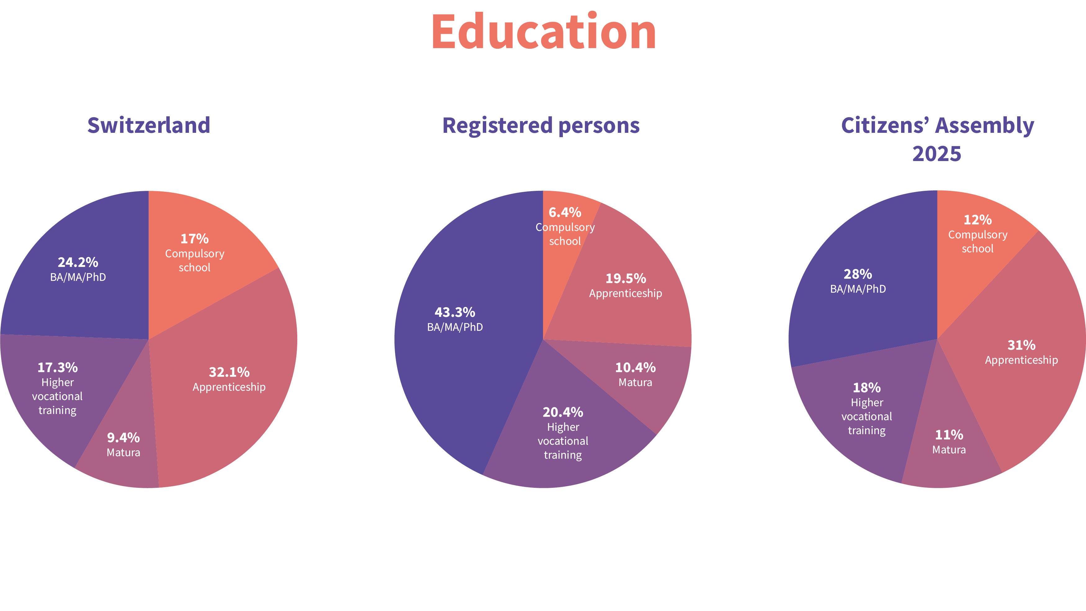 Based on previous experiences with recruitment procedures for citizens’ assemblies, the criterion of “education” is particularly challenging when it comes to achieving a balanced distribution. Individuals without post-compulsory education not only participate less frequently in elections and referendums, but are also significantly harder to engage in more intensive forms of participation. Conversely, individuals with higher levels of education are disproportionately willing to take part in citizens’ assemblies. The second sortition largely corrected this imbalance, although there remains a slight underrepresentation of individuals without post-compulsory education in the Citizens’ Assembly.