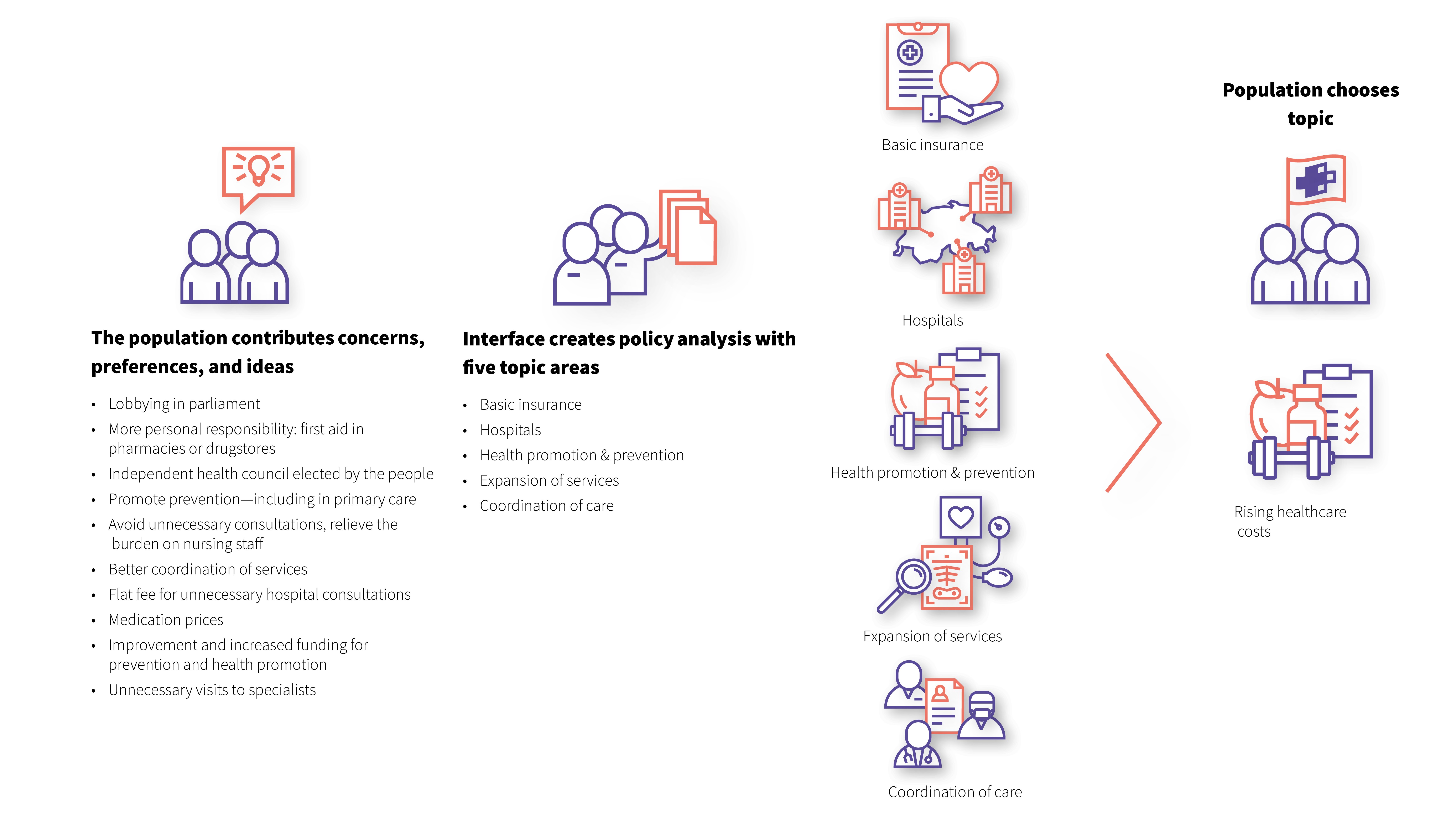 In a second step, a run-off vote was held between the two top-ranked topics, “Coordination of healthcare provision” and “Health promotion & prevention.” In this vote, 60% of the participants present chose “Health promotion & prevention” for further in-depth discussion.