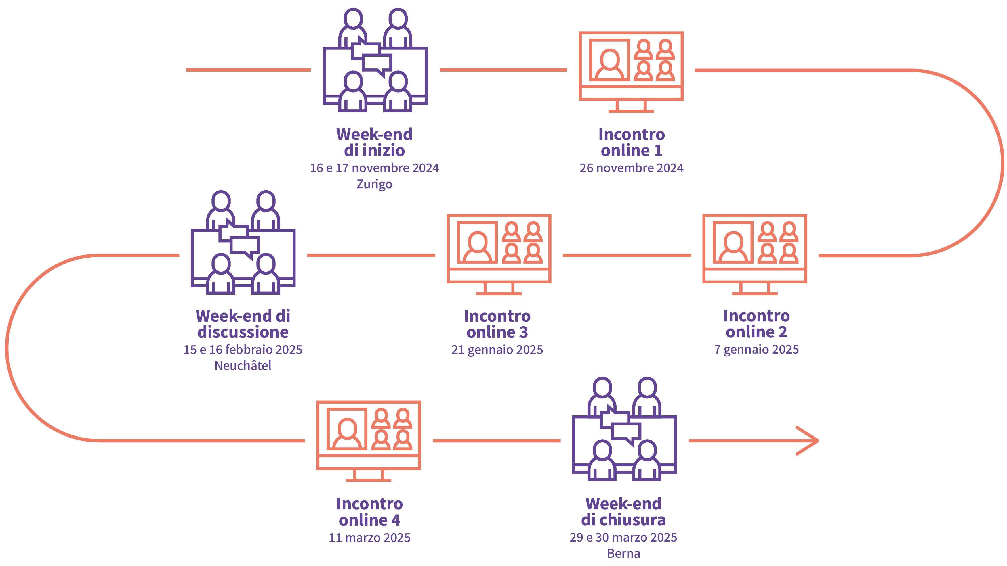 Negli incontri online le persone partecipanti hanno approfondito il tema in cinque gruppi regionali: Svizzera nord-occidentale, Svizzera orientale, Svizzera romanda, Ticino e Svizzera centrale.